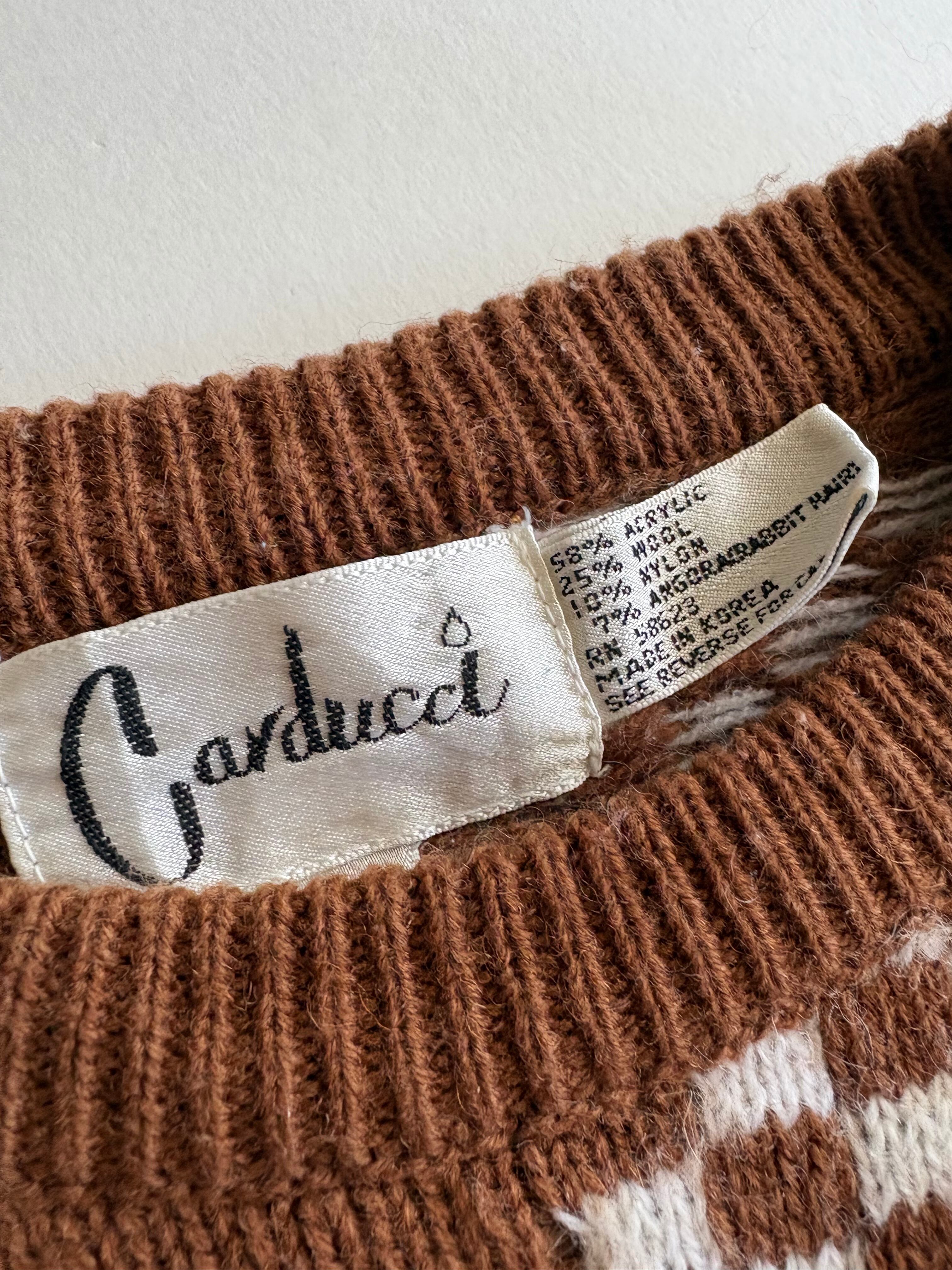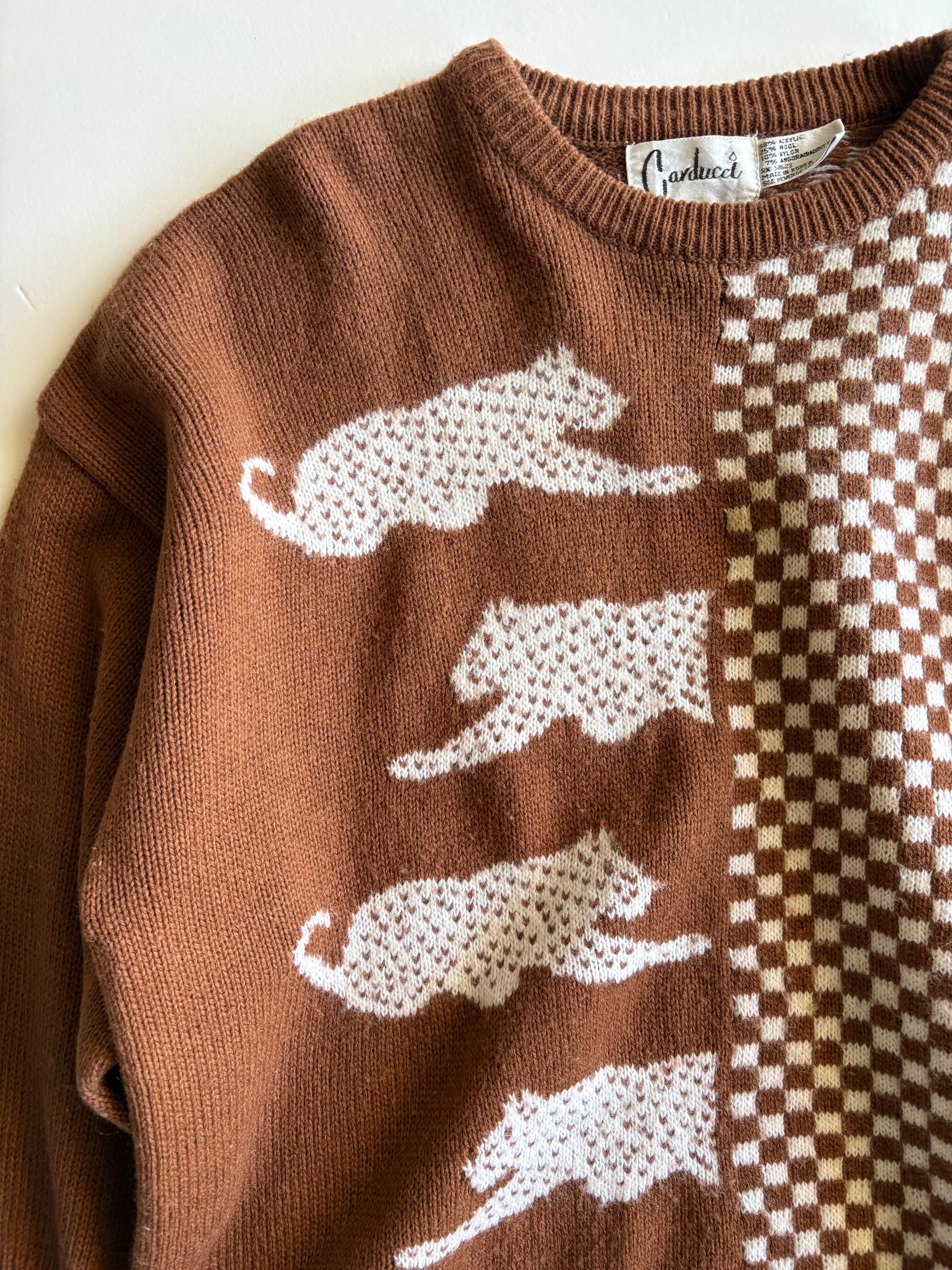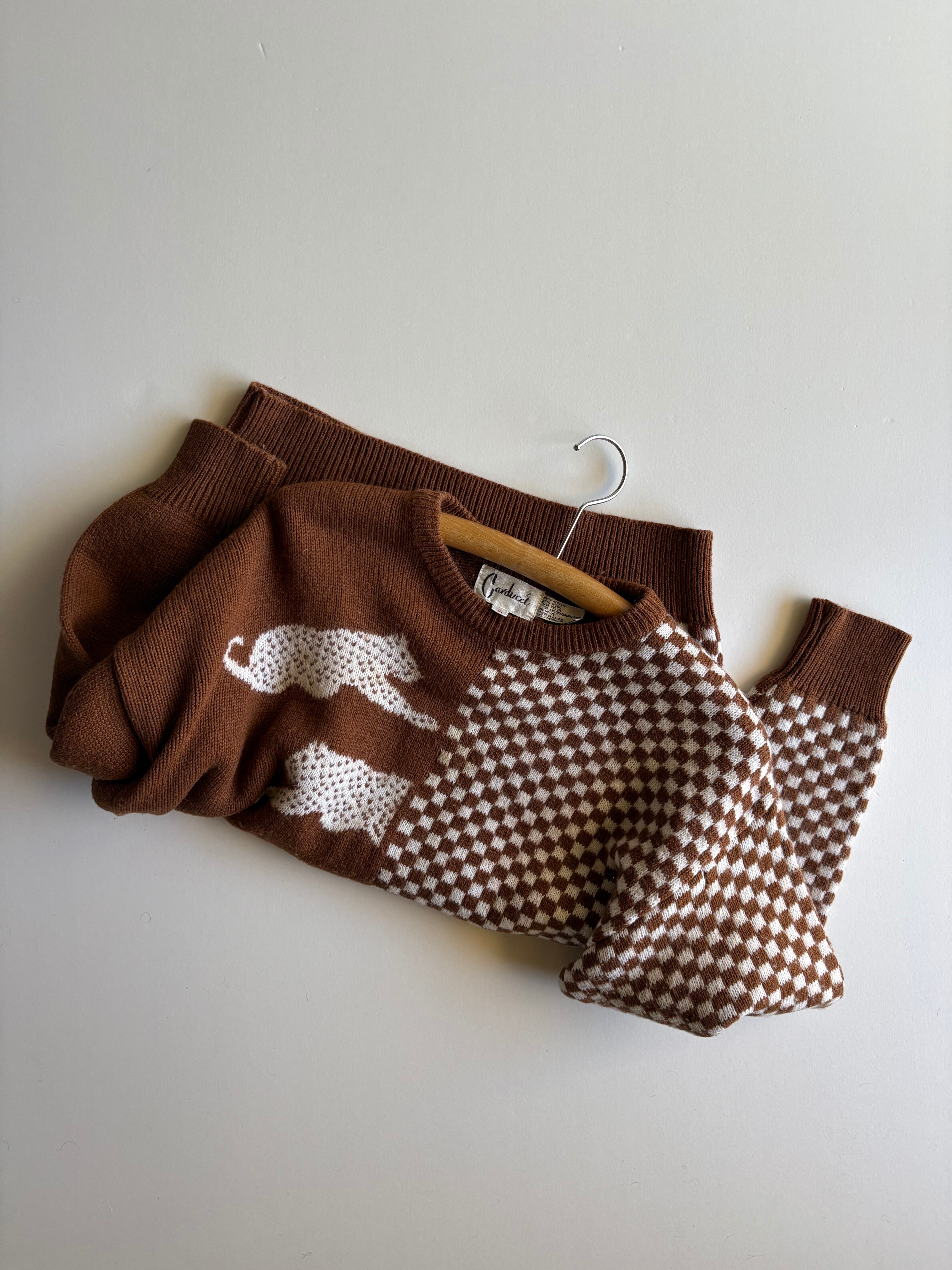 ブラウンボディのチェッカー柄とアニマルデザインのウールニット。