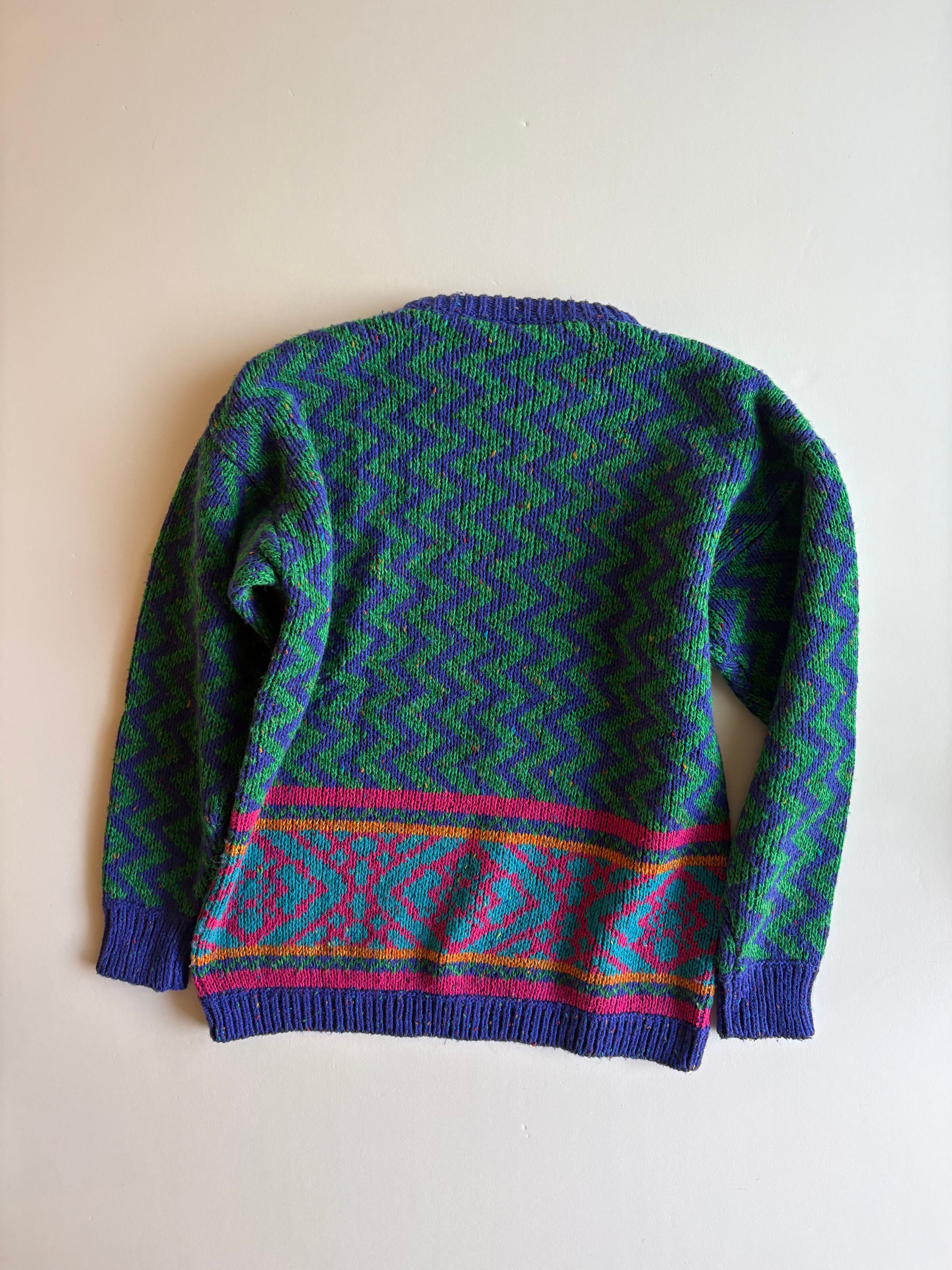 グリーン×ムラサキ×ピンクのカラーリングの、カラーリングの幾何学模様のウール混合ニット。