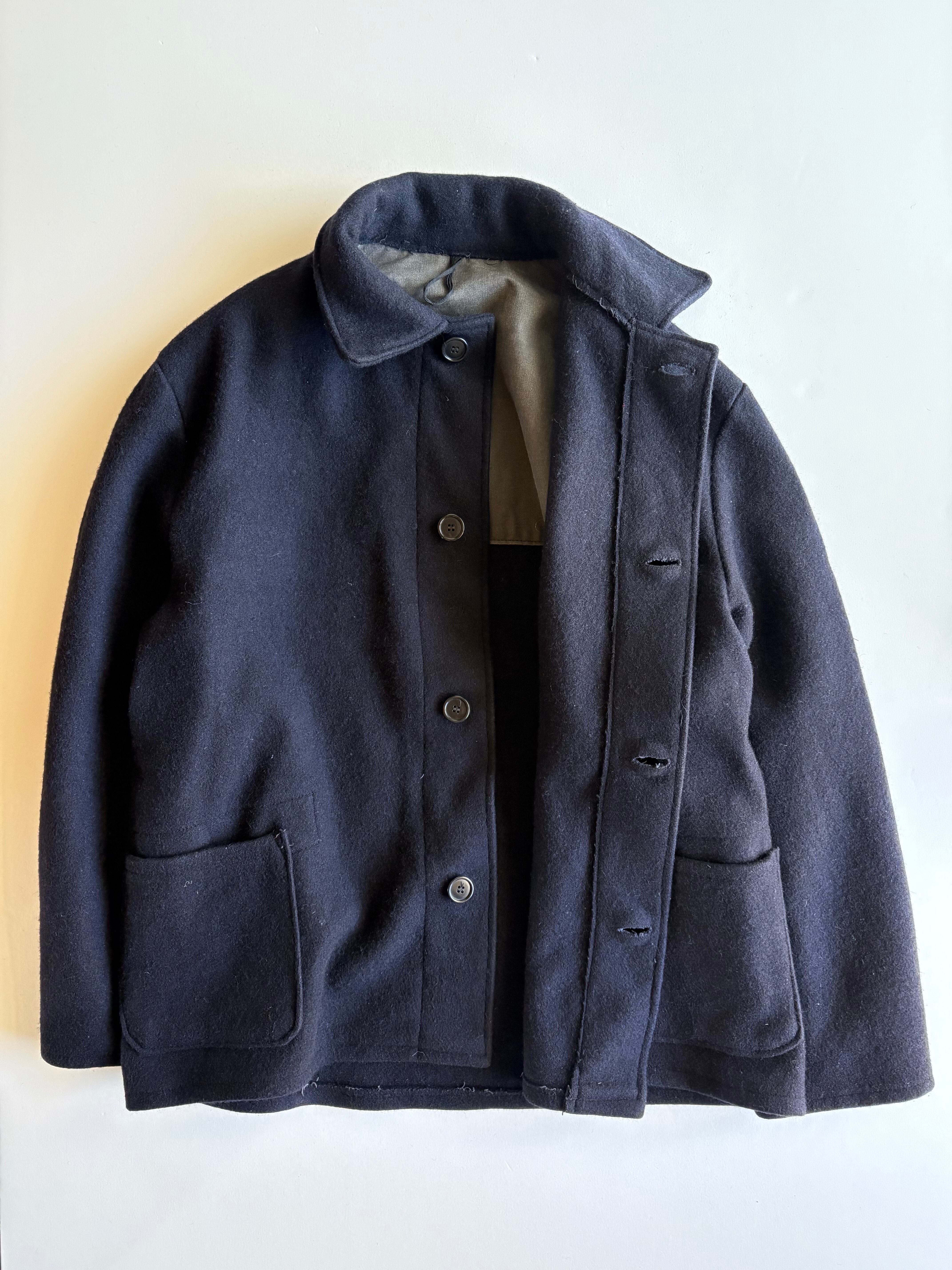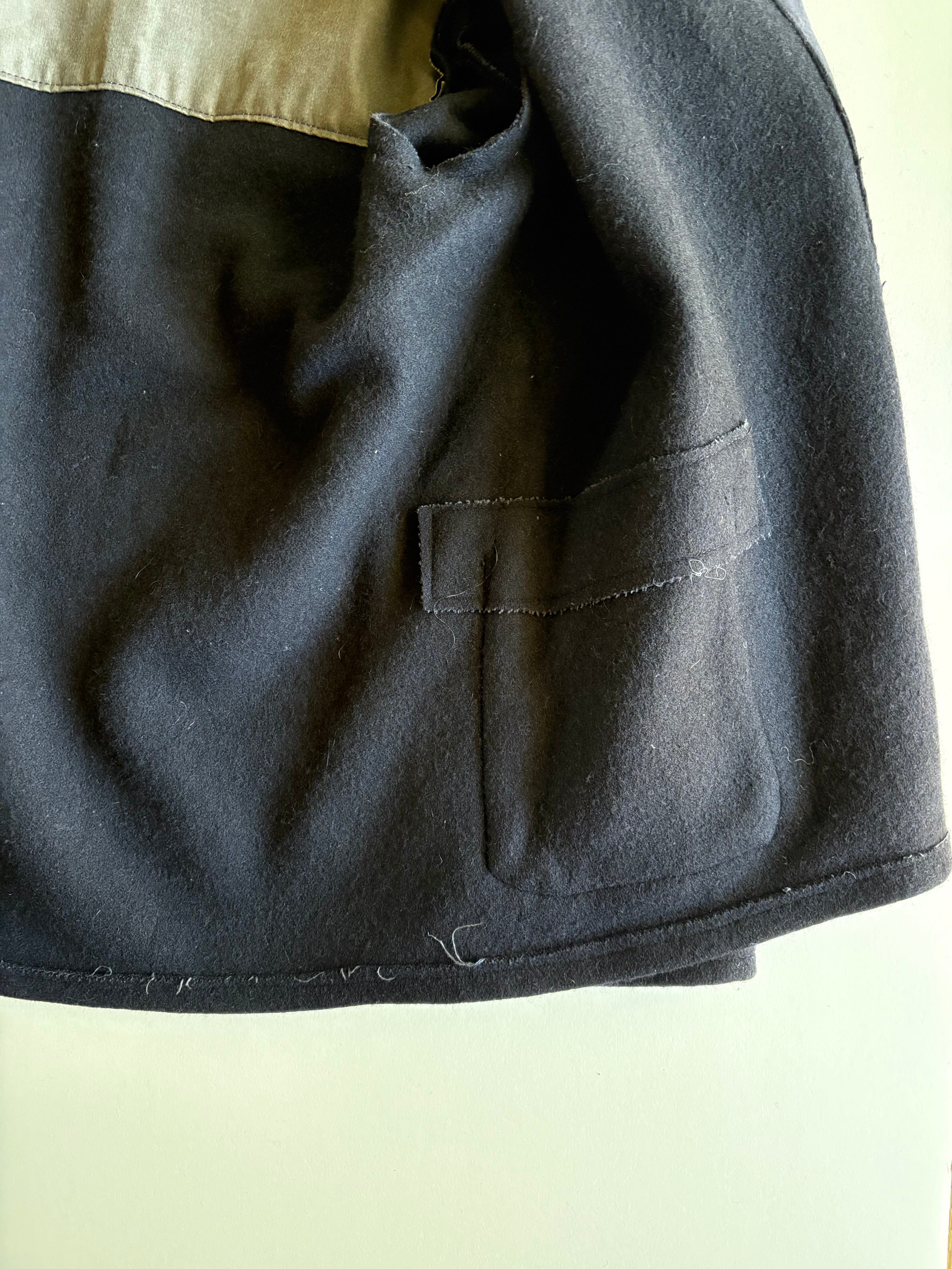 重たいものを担いだりしても破けやほつれが起こりづらいように、肩周りや腕の一部をPVC(合皮)などで覆い、寒い場所で着用できるようにその他はウールを用いたジャケット。