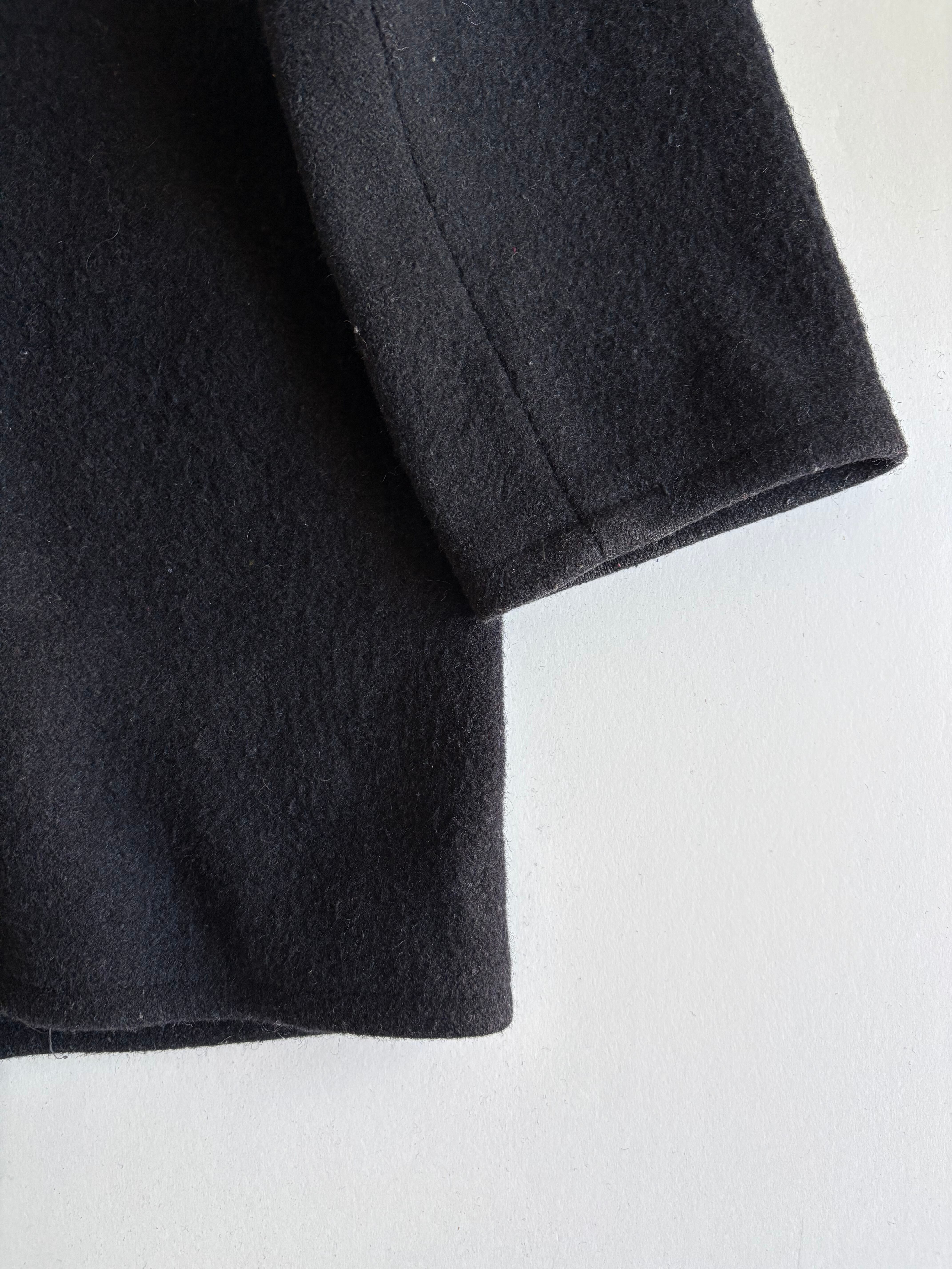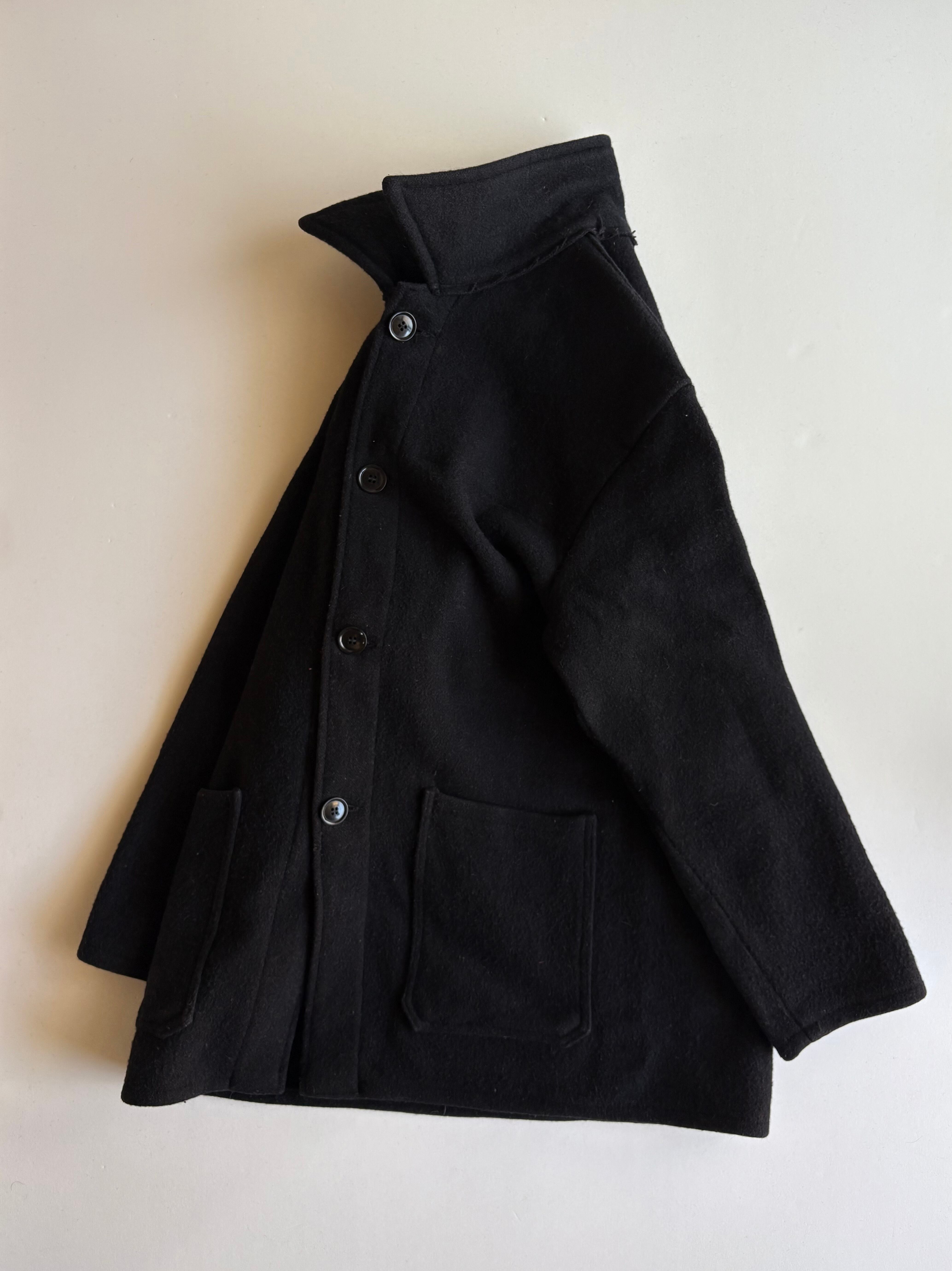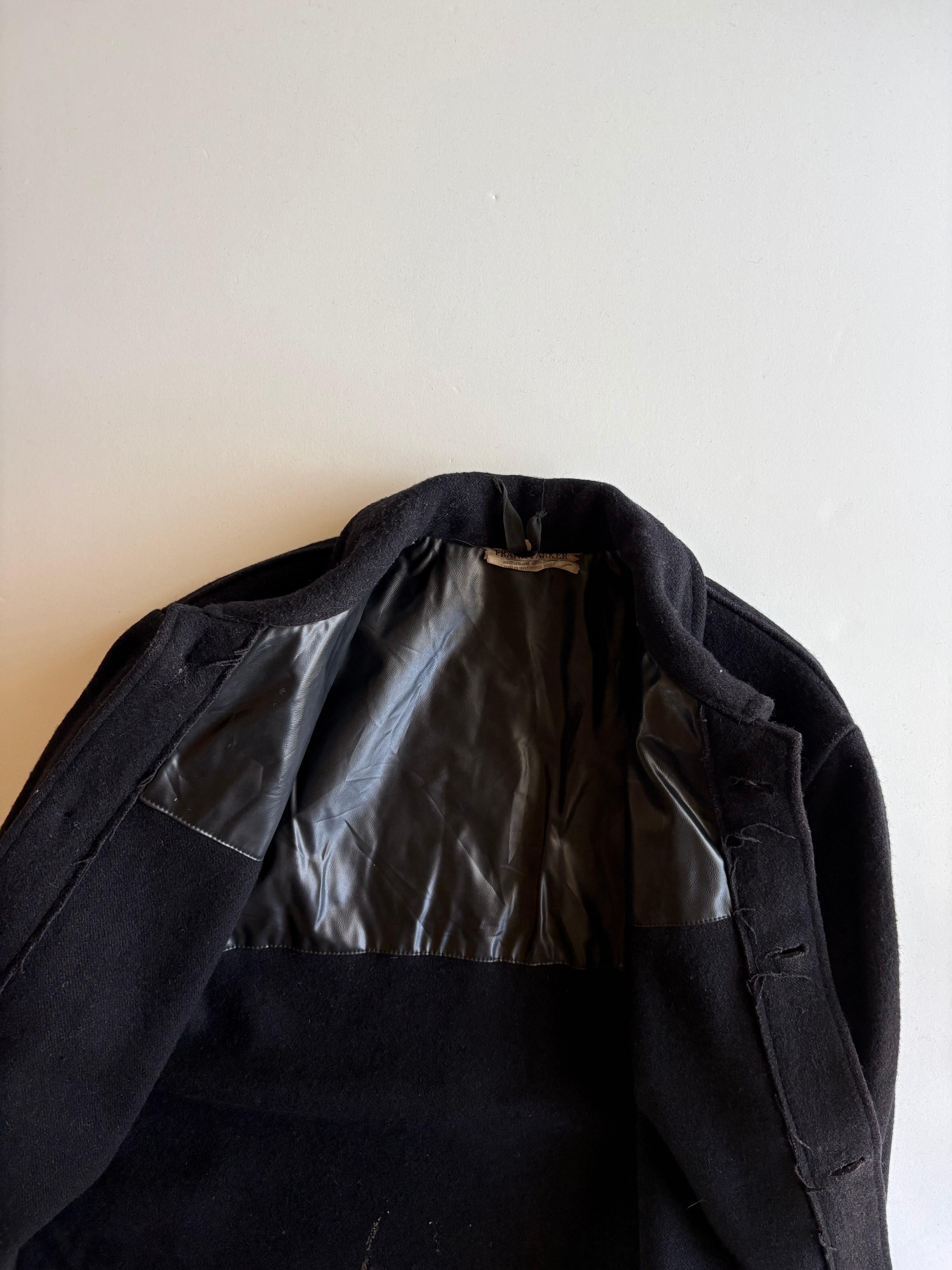 重たいものを担いだりしても破けやほつれが起こりづらいように、肩周りや腕の一部をPVC(合皮)などで覆い、寒い場所で着用できるようにその他はウールを用いたジャケット。