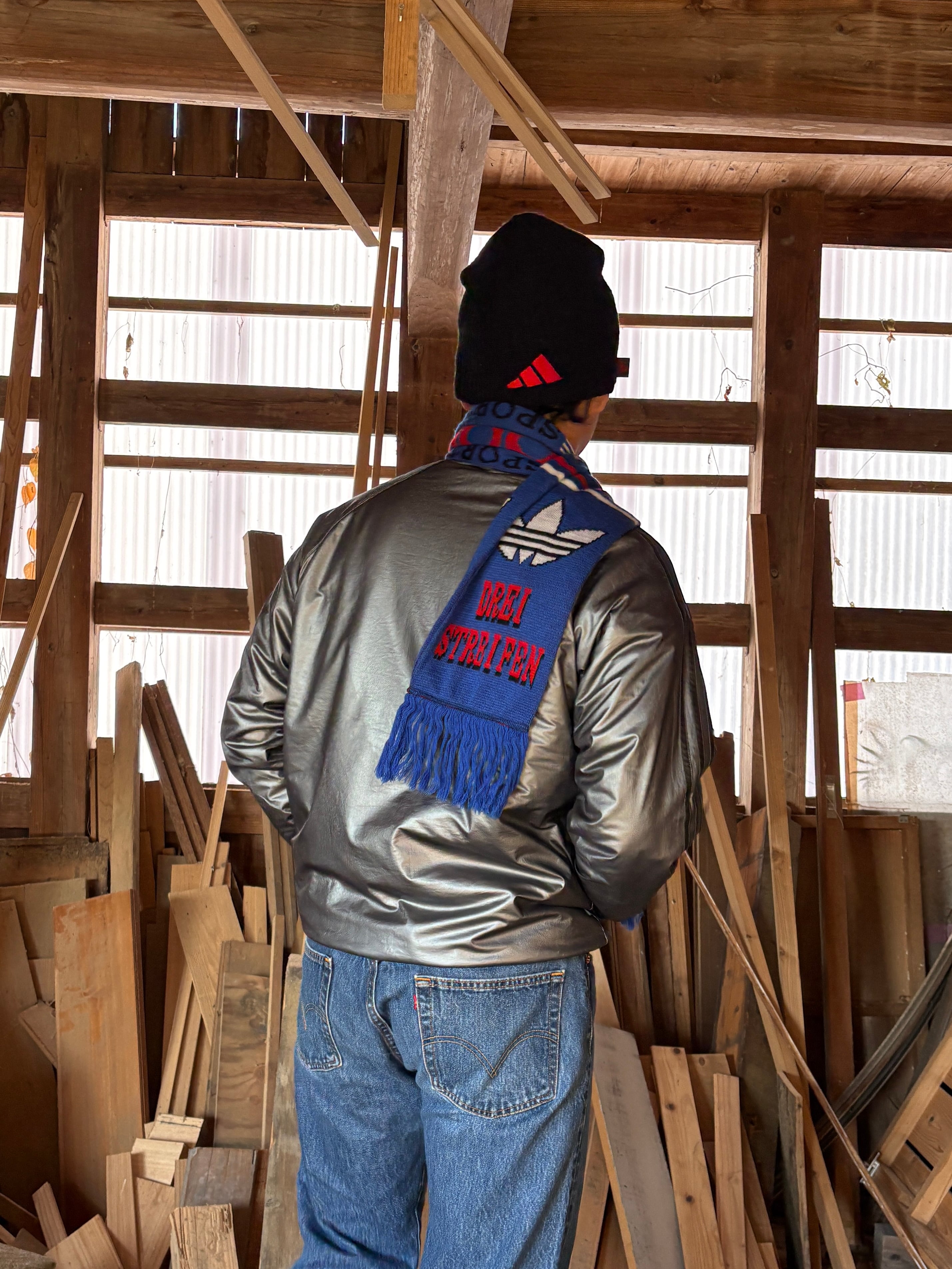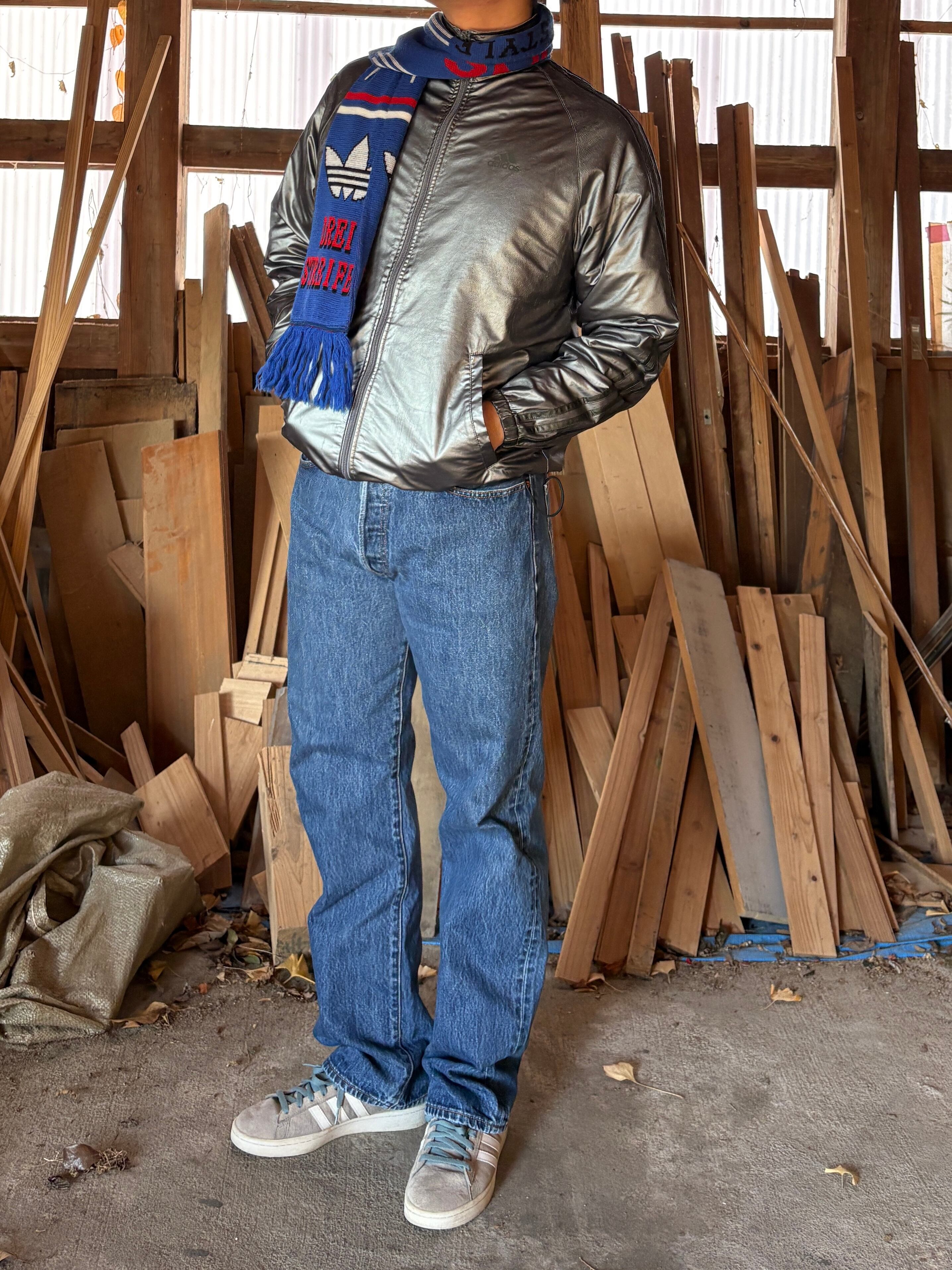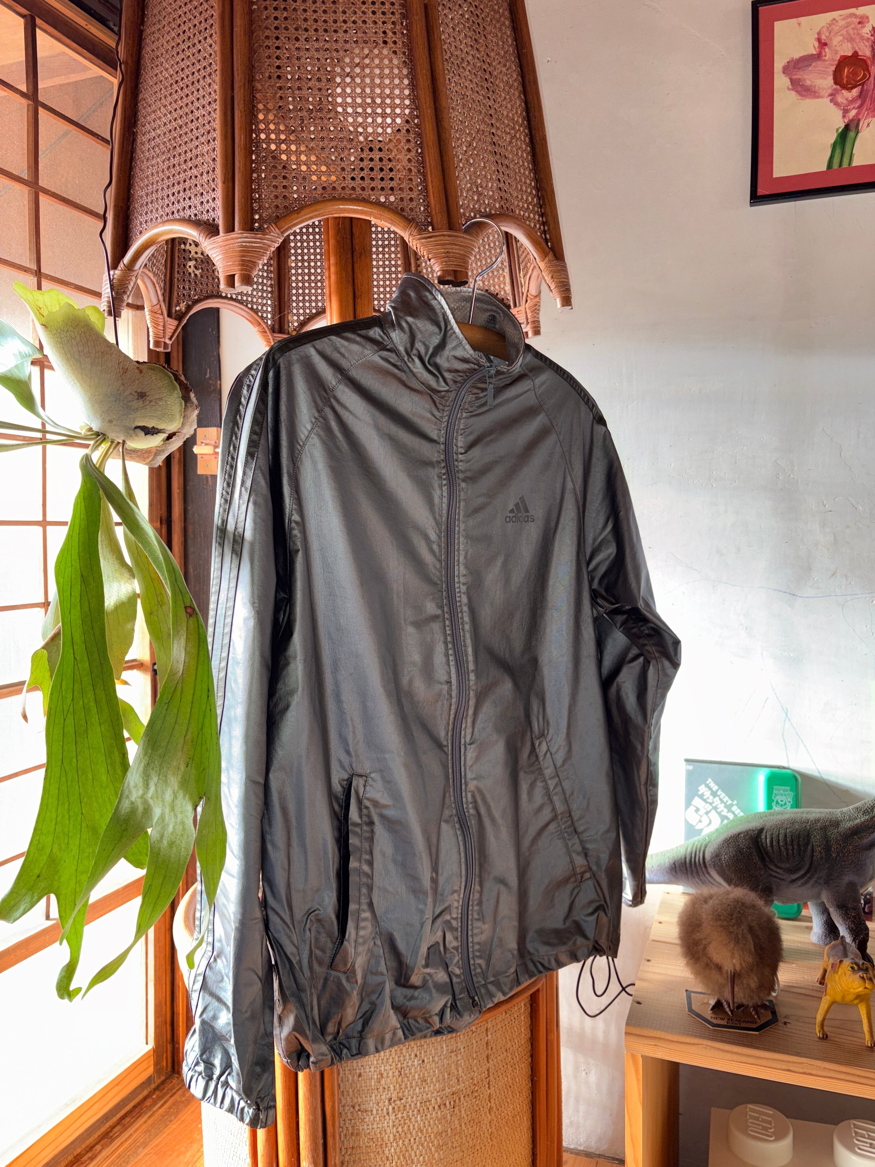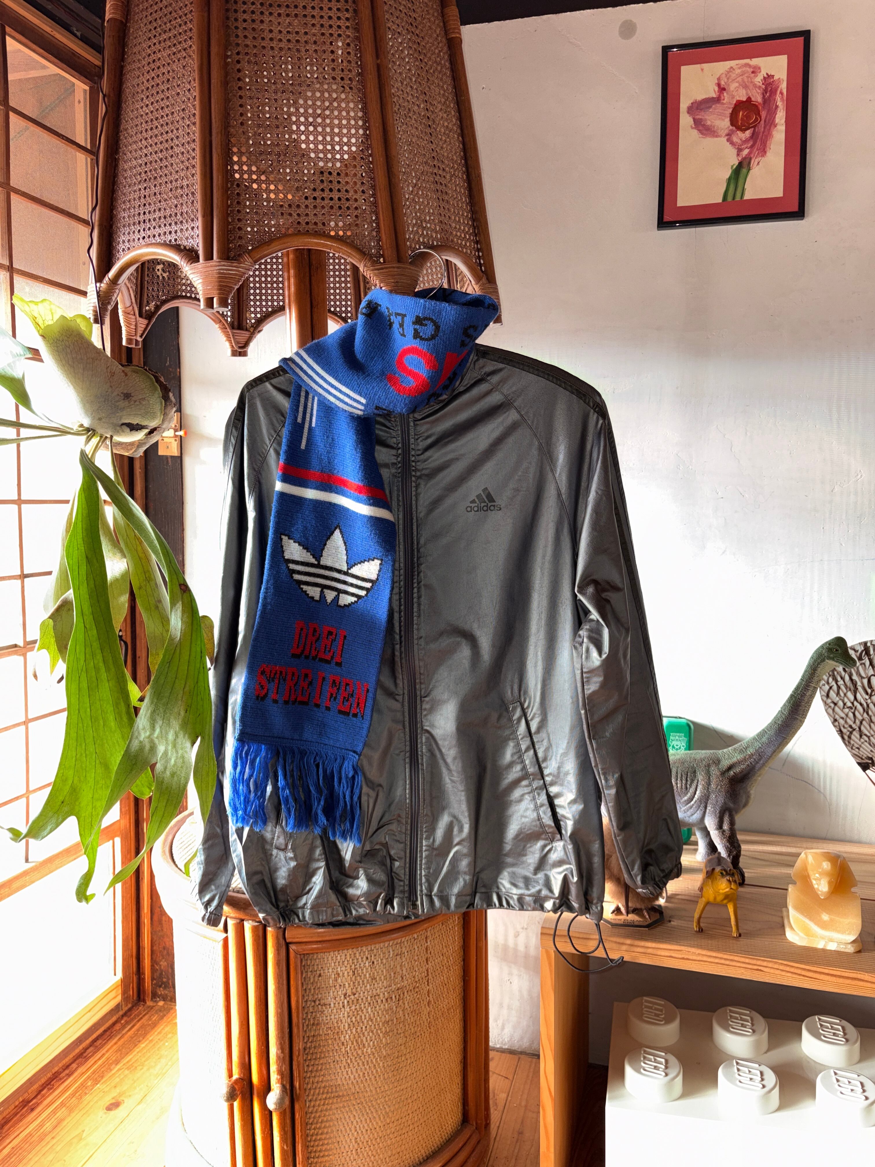 シルバーの色味に、グレーのスリーストライプという大人な雰囲気のトラックジャケット。